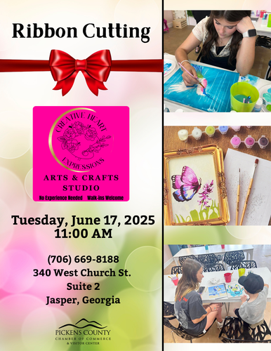 Join us for Creative Heart Expressions Ribbon Cutting on Tuesday, June 17, 2025. The Ribbon Cutting will begin at 11:00 am at 340 West Church St. Suite 2, Jasper, Georgia. These events are open to the public and free to attend. We look forward to seeing everyone there.